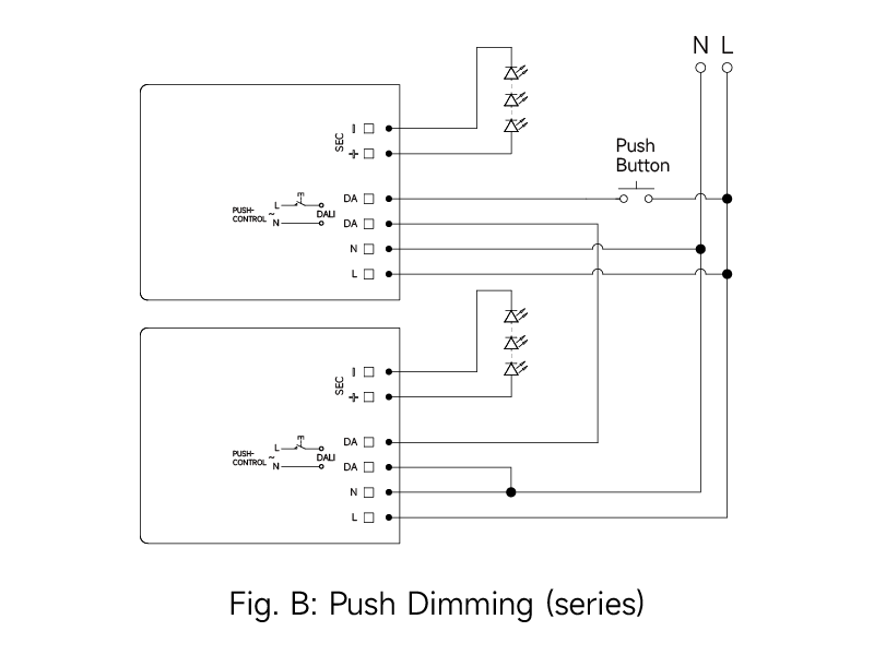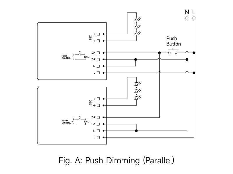 PUSH dimming synchronization | Parallel: 15 units Max. Series: 25 units Max. |
