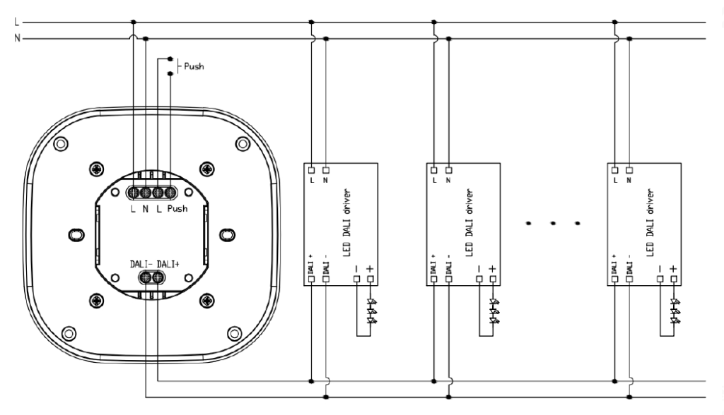 2. DALIterminal wiring length shall no longer than 300m and current not higher than 100mA; PUSH terminal wiring length shall no longer than 15m.