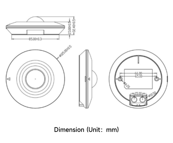 | Radius detection range(based on 100% sensitivity) | 2.5-4m @25℃ based on 3m mounting height | |