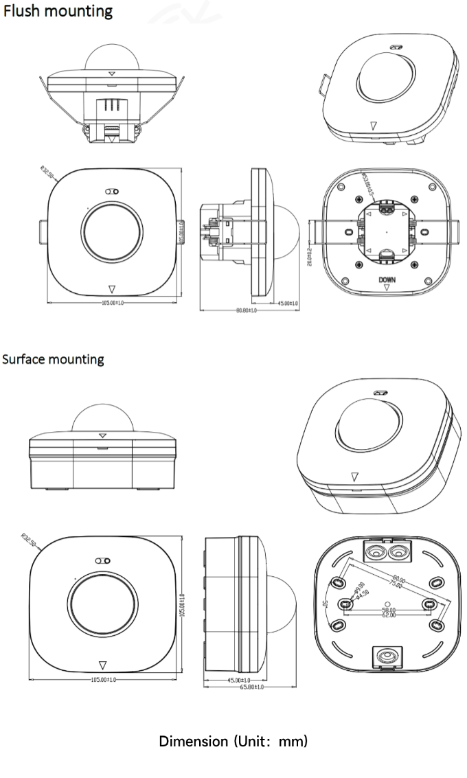 • Product size:105x105x80.8mm(flush mounting)、105x105x65.8mm(surface mounting)