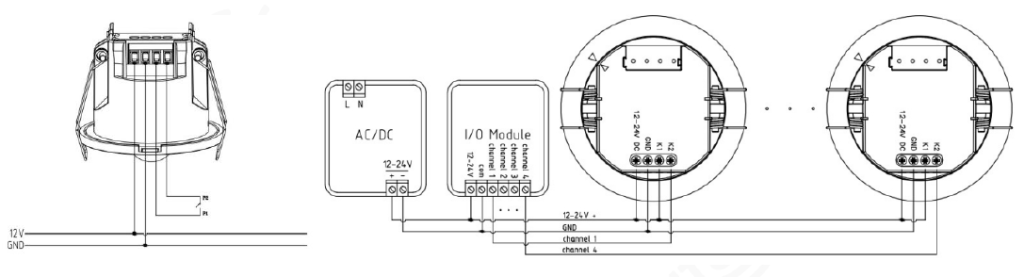 When power on,our sensor will enter self-checking mode and will not respond to any motion movement for 10s,within when K1 K2 terminal will be conducting. After 10s,our sensor will detect if there’s movement trigger. If no movement detected,K1 K2 terminal will disconnect,if movement detected, K1 K2 terminal will remain conducting until no movement detected and hold time passed.All sensor parameter such as detection range,hold time etc can be set by remote.